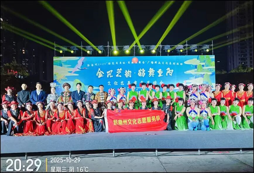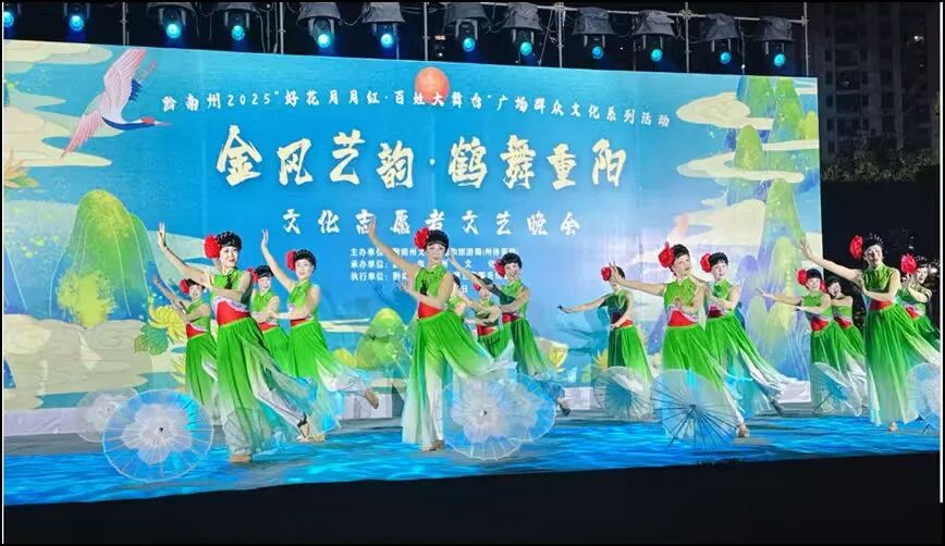 岁岁重阳,今又重阳。为弘扬中华民族“尊老、敬老、爱老”传统美德,2025年10月29日晚,由黔南州文化广电和旅游局(州体育局)主办,黔南州文化馆承办的黔南州“金风艺韵·鹤舞重阳”文艺晚会在都匀市水上体育中心隆重举办。