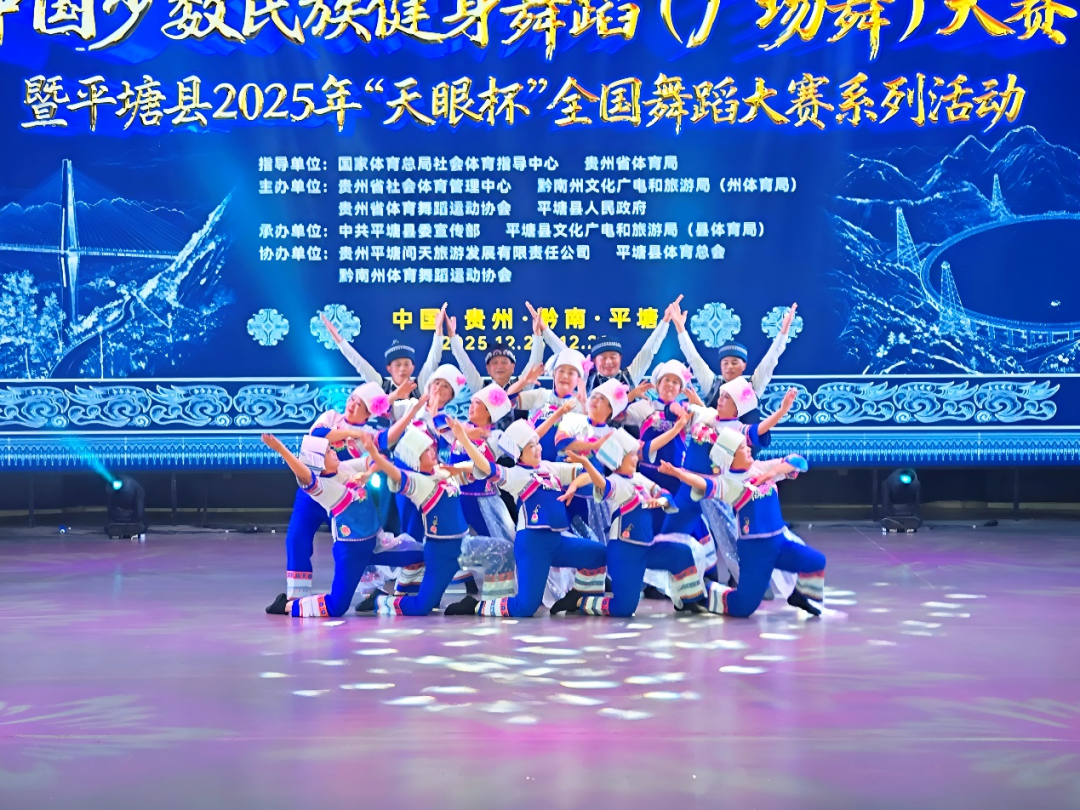12月28日,2025年中国少数民族健身舞蹈(广场舞)大赛暨平塘县2025年“天眼杯”全国舞蹈大赛在平塘县落幕。惠水县好花红俏夕阳民族艺术团凭借一支充满布依风情的舞蹈《贵州美》,在激烈角逐中脱颖而出,斩获广场舞自选动作项目二等奖。