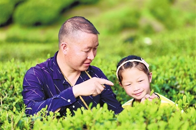 汽车穿过层层山脉,沿山而建的新楼房鳞次栉比。记者来到了海拔1000多米的三都县大河镇和平村——江叶石门坎茶场。站在山巅,春风拂过茶树吹起千层浪,小孩们穿梭在茶树间,大人弯腰采茶,不时传来的水族山歌,融汇成一副其乐融融、有声有色的春天“画卷”。