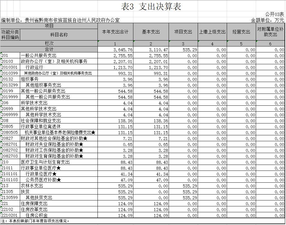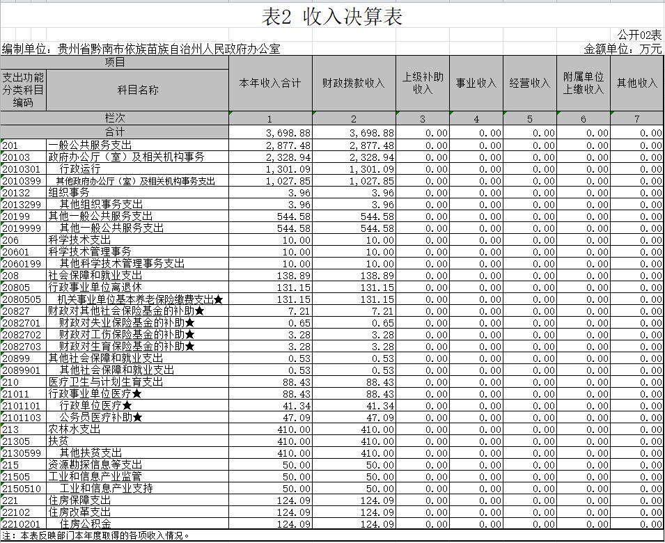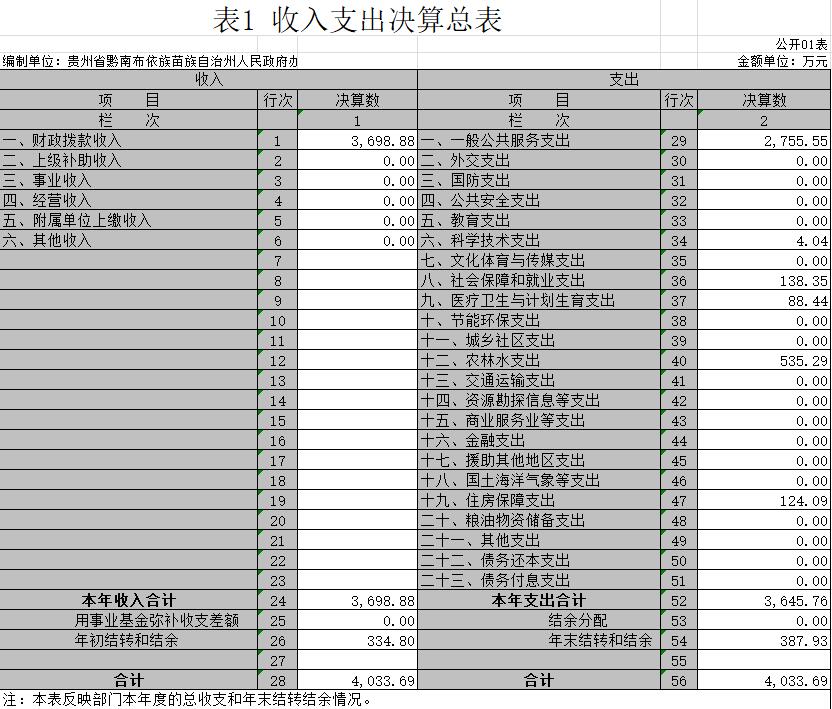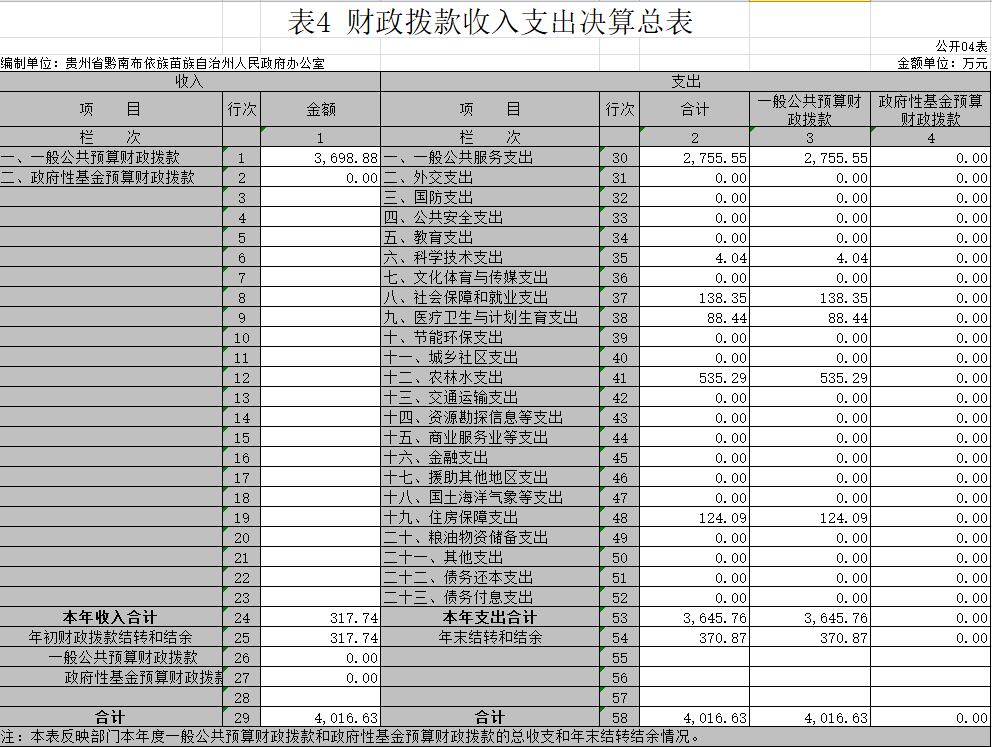 贵州省黔南布依族苗族自治州人民政府办公室2017年度收支决算总计4,033.69万元。(公开01表合计数)
