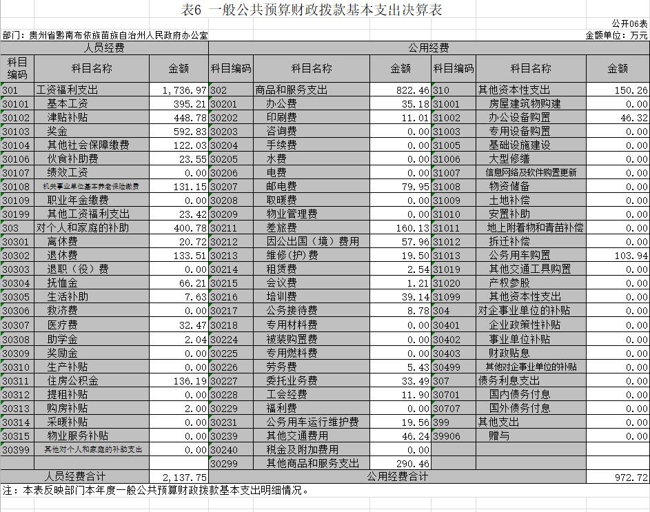 贵州省黔南布依族苗族自治州人民政府办公室2017年度一般公共预算财政拨款基本支出3,110.47万元,其中:人员经费2,137.75万元,主要包括基本工资、津贴补贴、离退休费等;公用经费972.72万元,主要包括办公费、水电费、差旅费等。