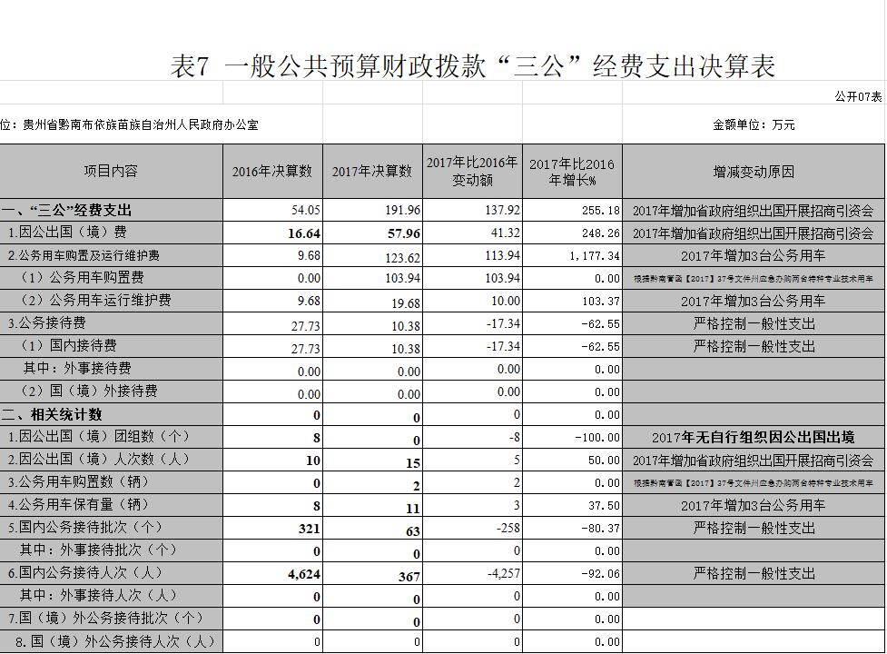 黔南布依族苗族自治州人民政府办公室2017年度部门决算及"三公"经费决算公开说明