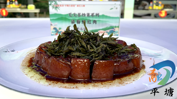 参赛选手王琴介绍:“我们今天黔布依带来的菜品是‘茶香红肉’,是由毛尖茶和红烧肉一起制作的。红烧肉需要腌制一个晚上,里面加入毛尖茶,有淡淡的茶香味,吃起来不太腻,希望大家以后吃到这道菜的话可以想到我们都匀的毛尖茶。”