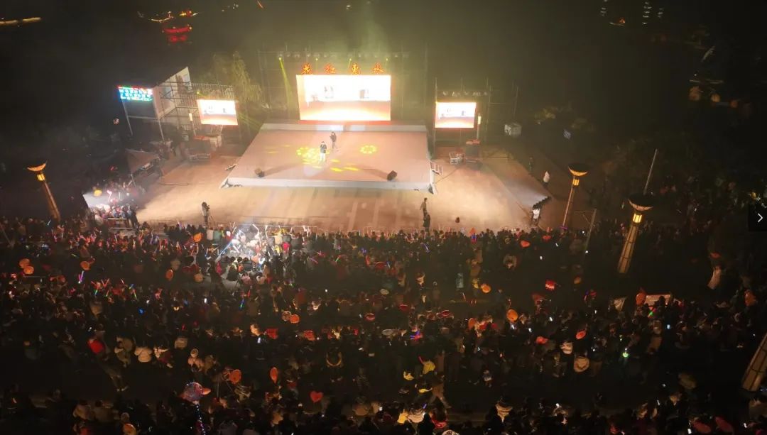 晚上八点,河畔台阶上早早坐满了观众,大屏幕正播放的贺岁电影引得大家哈哈大笑。电影放映结束后,舞台上灯光闪耀,音乐奏响,迎新音乐会正式拉开序幕。一首开场曲《龙的传人》瞬间点燃观众激情。随后,《好花红》《给我一个理由忘记》《易燃易爆炸》等一首首动听的歌曲轮番唱响,为观众呈现了一场极致的视听盛宴,大家随着节奏摇摆、欢呼,现场气氛热闹非凡。