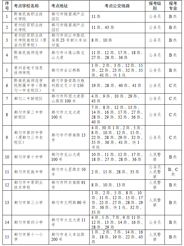由于本次笔试的考点较多,分布较广,建议您提前了解乘车路线查看考点地址,考试当天务必提前出发前往考点,尤其要把堵车因素和入场检测时间考虑在内。如果您是外地考生,建议您在考点附近住宿。黔南考区考点及公交车线路分布情况如下:
