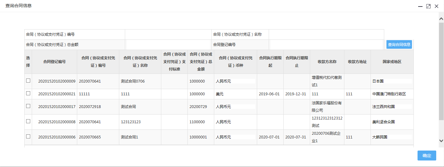 该窗口展示了系统中所有与该扣缴义务人相关联的各个环节采集的非居民合同信息,具体包括:非居民企业所得税法定扣缴环节、发包工程劳务报告环节、对外支付税务备案表环节、其他代扣代缴、代收代缴申报环节采集的合同信息,勾选后点击【确定】即可选择已有合同信息。