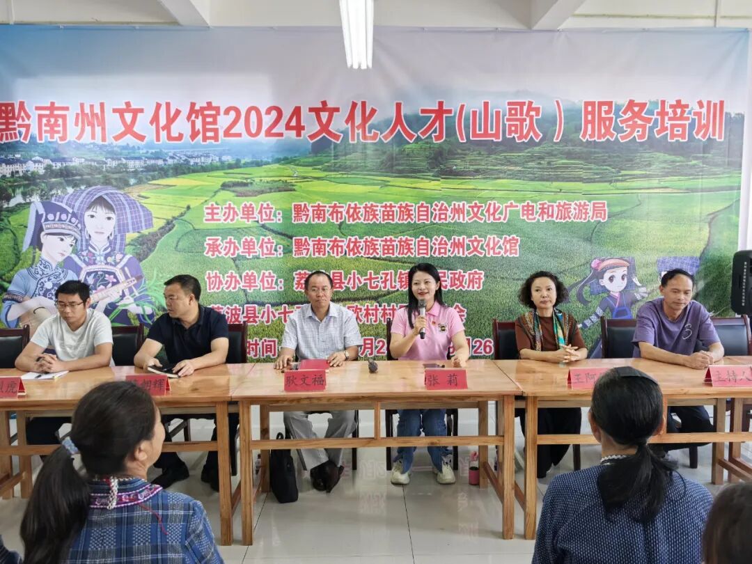 为深入贯彻习近平新时代中国特色社会主义思想和党的二十大精神,进一步弘扬和传承民族优秀传统文化,充分发挥州级文化艺术部门职能和专业技术人才优势,全力推动基层文化艺术事业繁荣发展,突出抓好贫困地区和民族地区文化艺术进行培训指导任务,同时利用这一独特文化形式宣传党的方针政策,助力乡村振兴,2024年9月24日上午,由黔南州文化广电和旅游局主办,黔南州文化馆承办,荔波县小七孔镇人民政府、荔波县小七孔镇拉欧村承办的黔南州文化馆2024文化人才(山歌)服务培训在荔波县小七孔镇拉欧村布依族非遗研学基地开展培训。