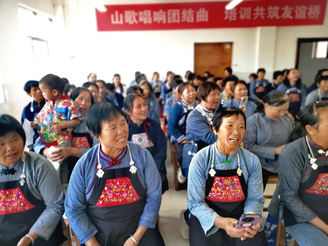 此次培训目标任务围绕打造世界级旅游目的地发展目标,挖掘和传承优秀民族文化资源,丰富当地旅游文化内容,增强民族文化自信和发展动力,带动乡村旅游发展,促进当地经济发展,助力乡村振兴。本次培训邀请了贵州省省管专家,省、州政府特殊津贴专家,国家一级演员,黔南州原歌舞团团长,黔南州文化馆原馆长王阿依进行授课。第一期培训为期三天,课堂设在室内和美丽的龙江河畔的田间地头,在那悠扬山歌的培训课堂上,学员们仿佛被古老旋律的魔力深深吸引,他们的眼神凝聚成一束束专注的光芒,紧紧追随着老师的每一个细微动作和表情。每当老师示范到高亢激昂之处,学员们的脸上便不由自主地浮现出激动与向往之情。课堂上老师精彩的授课和优美动听的山歌每天都吸引了近200名山歌爱好者的参与,教室、楼道和田间地头都挤满了前来学山歌的爱好者。课堂上回荡的山歌声和灿烂的笑容交织成一幅幅动人的画卷。课后学员抱着老师久久不愿离去,激动的对老师说:这是他们这辈子最开心的一天,培训活动反响热烈,成果显著。