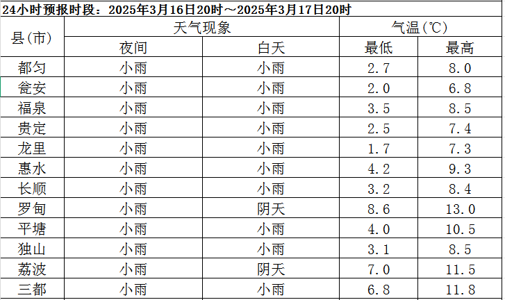今天(16日)夜间至17日,全州阴天有阵雨或雷雨,雨量小雨;18日,白天州北部、西部地区阴天有阵雨或雷雨,雨量小雨,其余地区阴天,夜间全州阴天;19日,全州阴天间多云;20日,白天全州阴天,夜间全州阴天有阵雨或雷雨,雨量小雨;21日,州中北部地区阴天有阵雨或雷雨,雨量小雨,其余地区阴天。